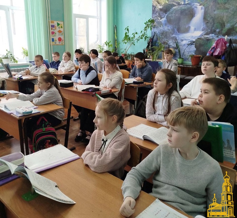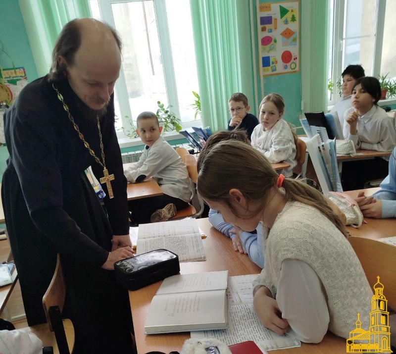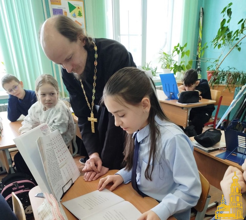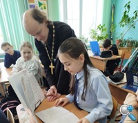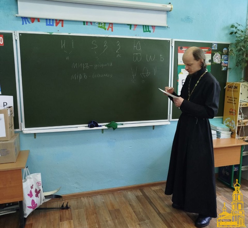 Настоятель Свято-Успенского храма (п. Горка) о. Андрей Комаров провел урок в 4 классе на тему "Церковнославянский язык".